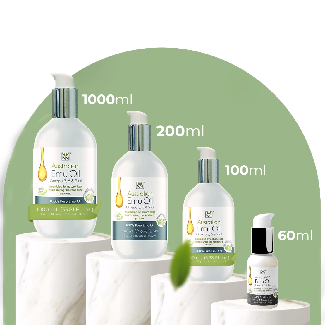 Emuoljan finns med pumpflaska i storlekarna 60ml, 100ml och 200ml. Det finns också en 1kg flaska som levereras utan pump. 1kg (ca 900ml) är ett prisvärt alternativ om man vill fylla på sin redan befintliga flaska med emuolja.